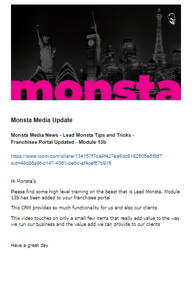 Monsta HQ sends regular Monsta Media News updates on all things Monsta Business.